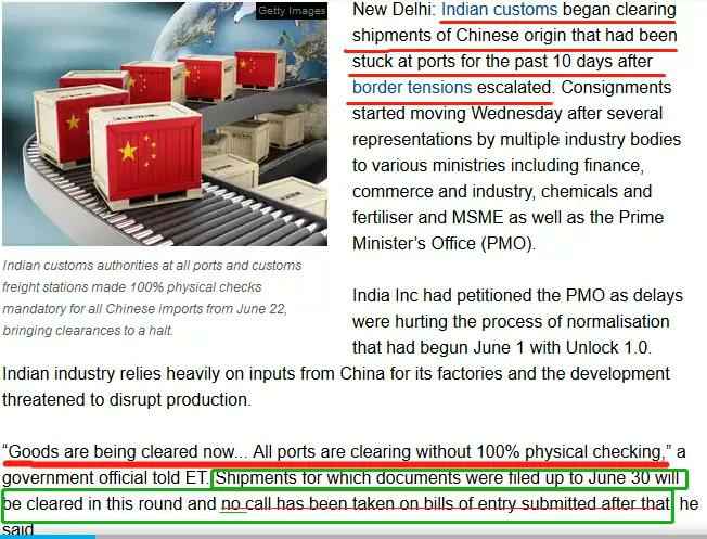 新德里、钦奈和孟买的海关经纪人协会的官员证实了这一进展。然而,一名了解事态发展的人士表示,周三(7月1日)开始,美国和韩国企业的进口许可仍将继续。官员们表示,已向海关当局提供了一份未经海关查验即可通关的公司名单。从6月22日起,印度所有港口和海关货运站的海关当局对所有从中国进口的货物进行了100%的强制检查,暂停了通关。尽管官方没有发出这方面的指示,但当局表示,正在根据有关情报警报进行检查。当时查验从钦奈开始,并很快蔓延到其它港口。除了医疗设备和汽车零部件,钦奈接收了大量进入印度的中国电子设备。